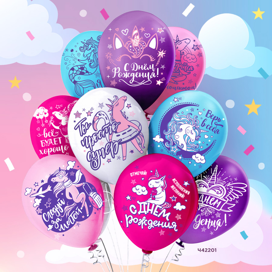 Ч42201 Шар12'' шелк рис. 2ст. 2цв. С днем рождения! Единорожка 5 дизайнов (25 шт./уп.) /БК